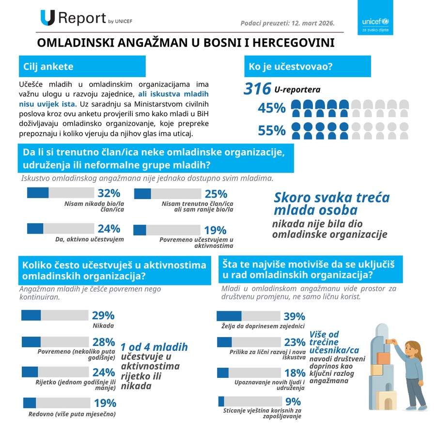 Učešće mladih u omladinskim organizacijama prepoznaje se kao važan element jačanja društvenog angažmana, aktivnog građanstva i participacije mladih u javnom životu. U kontekstu planirane izrade Informacije o omladinskom organizovanju u Bosni i Hercegovini, Ministarstvo civilnih poslova BiH je u saradnji s UNICEF BiH putem U-Report platforme proveo anketu s ciljem da se bolje razumije kako mladi vide ulogu omladinskih organizacija, šta ih motiviše na angažman i s kojim se izazovima susreću.